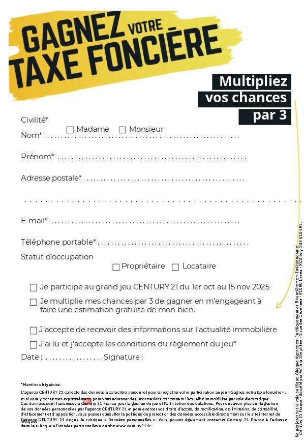 Ne laissez pas passer cette opportunité ! La taxe foncière est une dépense incontournable, mais cette année, elle pourrait vous coûter moins cher. Participez dès maintenant, remplissez votre bulletin et acceptez l’estimation de votre maison pour maximiser vos chances. Le gagnant sera tiré au sort le 21 novembre.